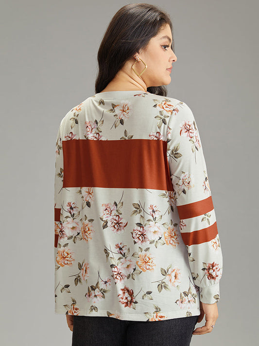 Floral Patchwork Colorblock Contrast Crew Neck T-shirt