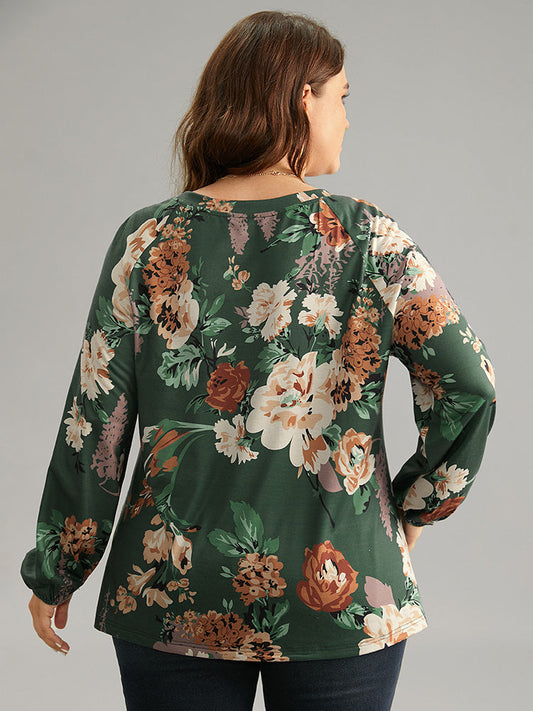 Floral Print Pleated Detail Lantern Sleeve T-shirt