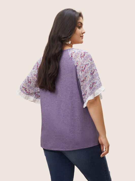 Ditsy Floral Patchwork Frill Trim Raglan Sleeve T-shirt