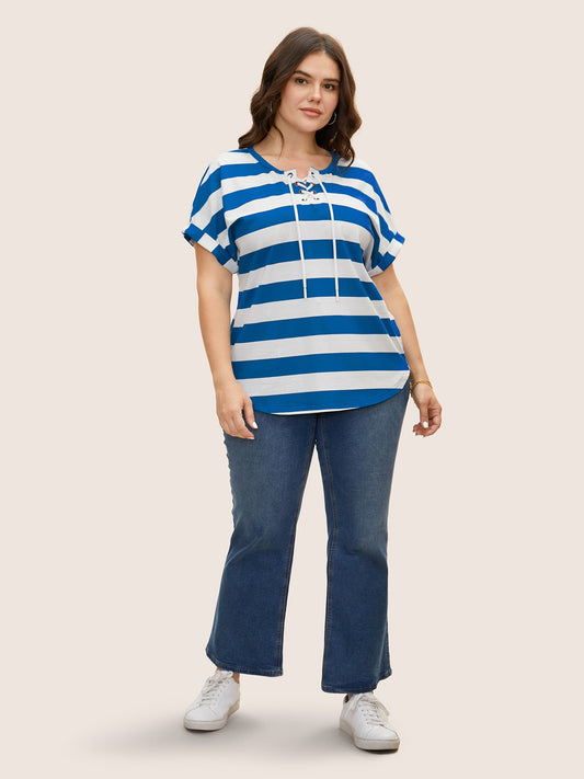 Striped Lace Up Arc Hem Batwing Sleeve T-shirt