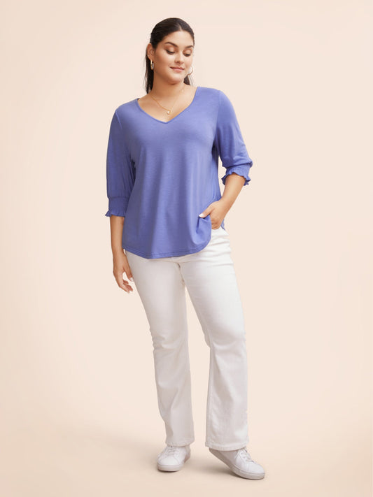 Solid V Neck Shirred Lantern Sleeve T-shirt