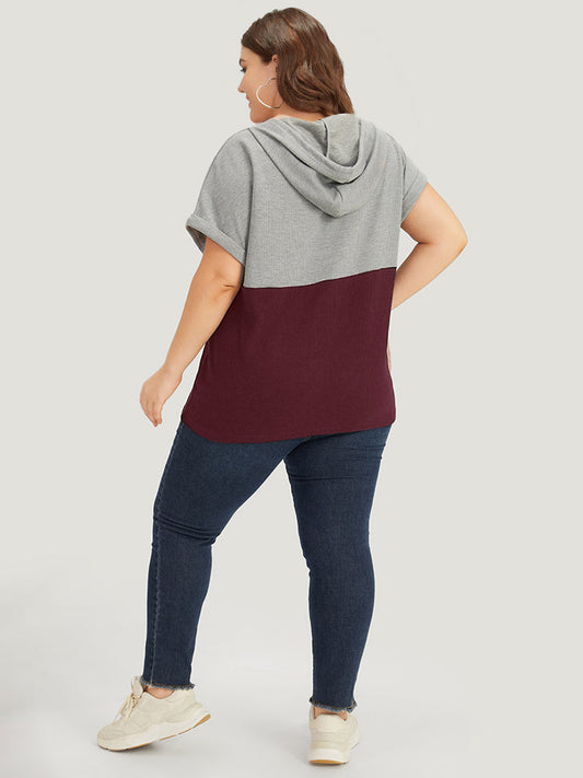 Contrast Drawstring Button Up Hooded Roll Dolman Sleeve T-shirt