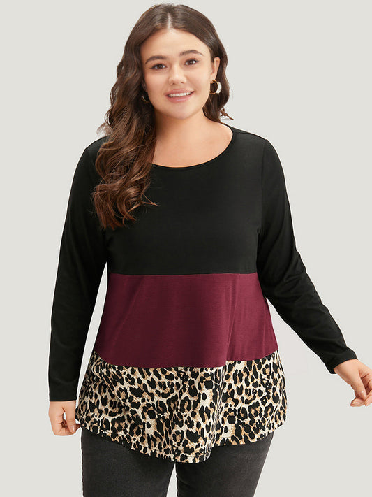 Colorblock Leopard Contrast Round Neck T-shirt