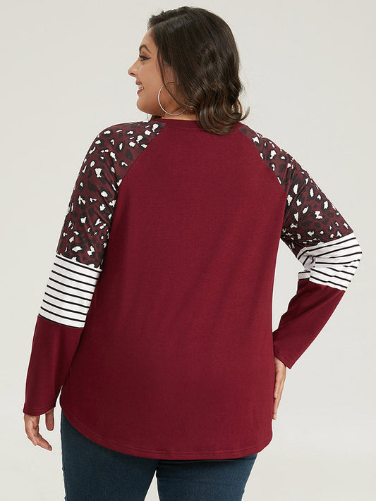 Leopard Striped Patchwork Raglan Sleeve T-shirt