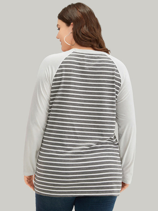 Striped Patchwork Button Detail Raglan Sleeve T-shirt