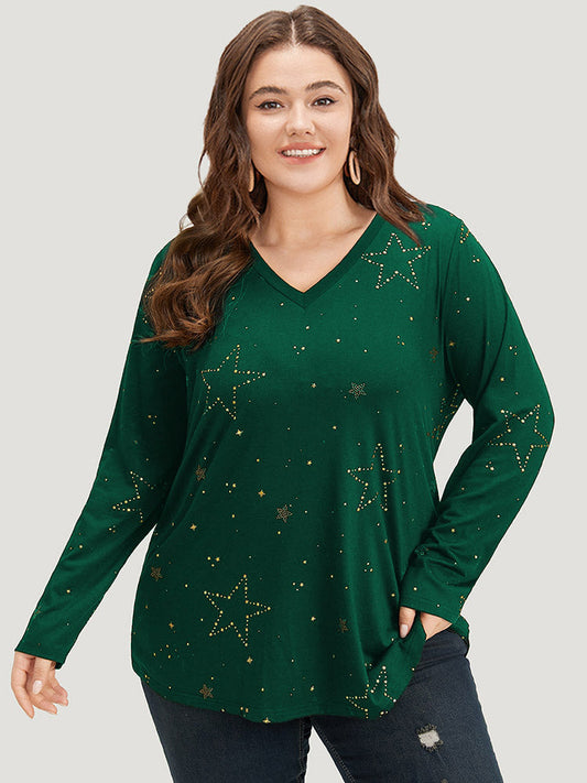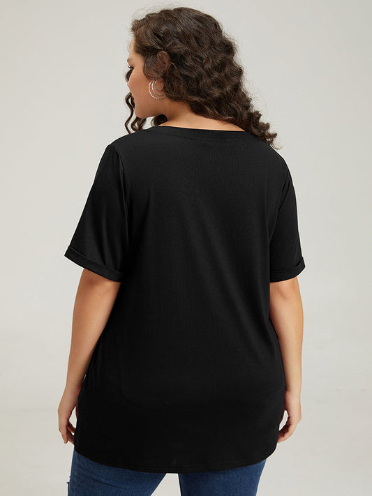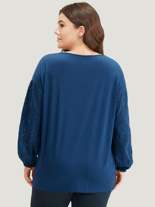 V Neck Broderie Anglaise Patchwork Lantern Sleeve T-shirt