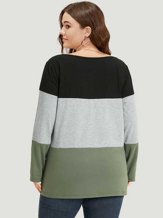 Colorblock Contrast Notched Long Sleeve T-shirt