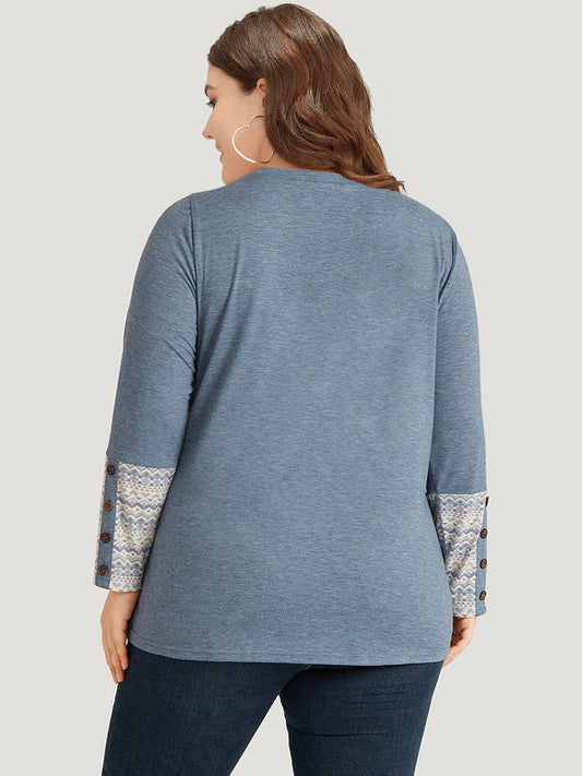 Bandana Print Patchwork Button Detail Crew Neck T-shirt