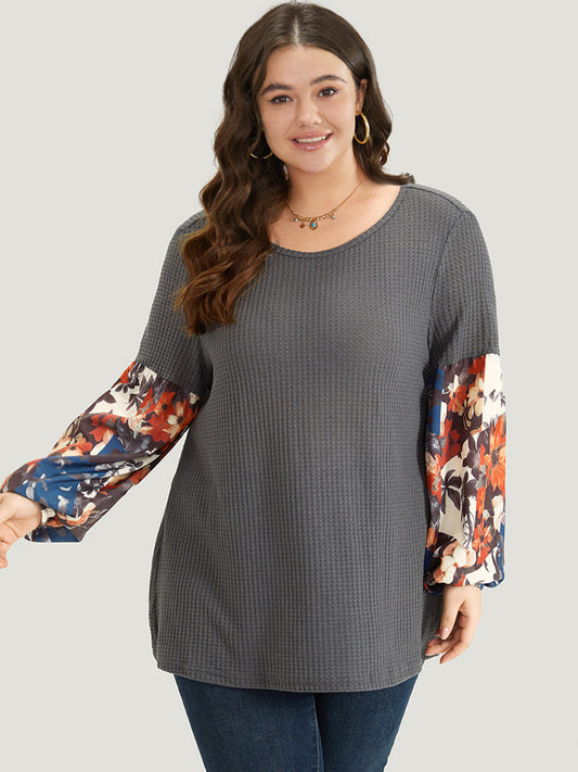 Waffle Knit Floral Print Patchwork Elastic Cuffs T-shirt