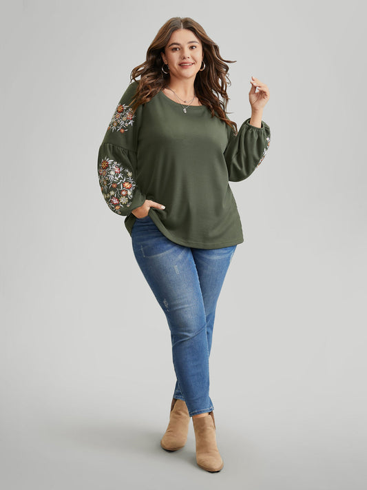 Waffle Knit Floral Embroidered Lantern Sleeve T-shirt