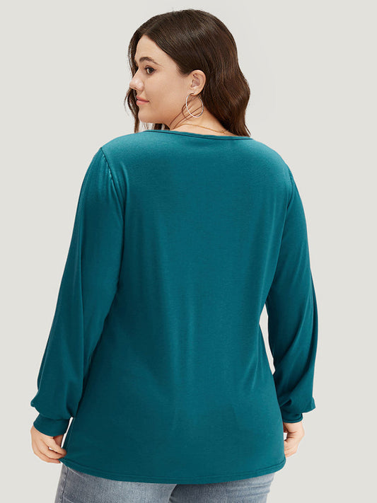 Plain Button Detail V Neck Elastic Cuffs T-shirt