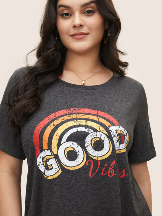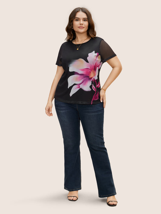 Round Neck Lily Print Patchwork Mesh T-shirt