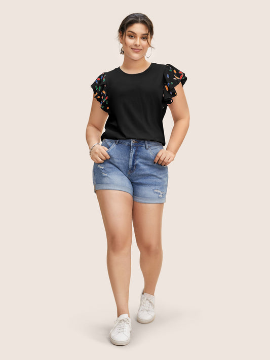 Colored Brush Print Ruffle Cap Sleeve T-shirt