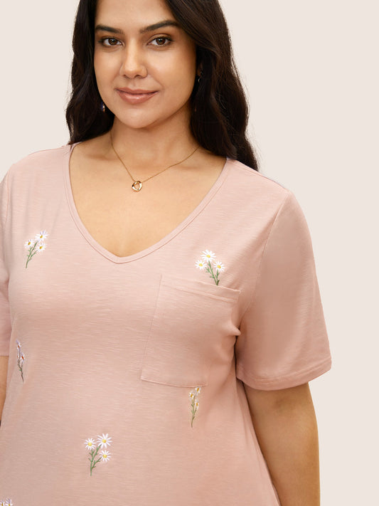 V Neck Floral Embroidered Patch Pocket T-shirt