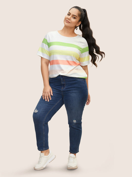 Round Neck Colored Striped Letter Print T-shirt