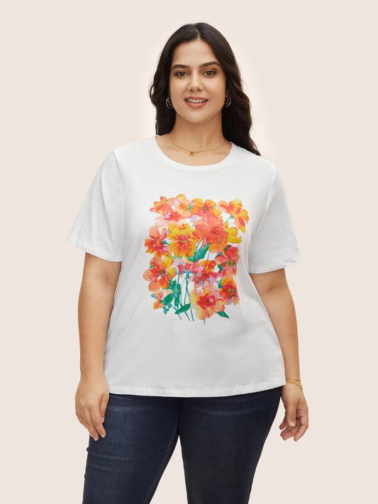 Cotton Crew Neck Flower Print T-shirt