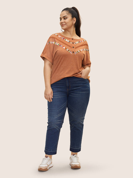 Boho Print Contrast Webbing Button Up T-shirt