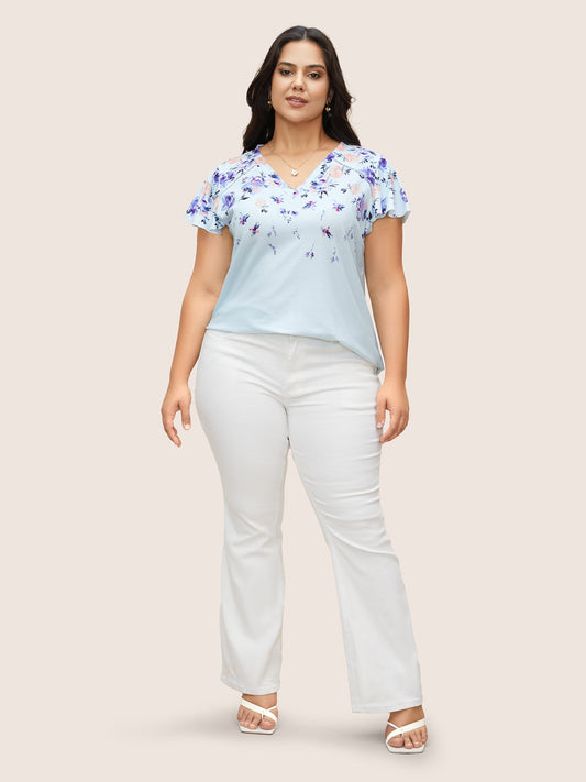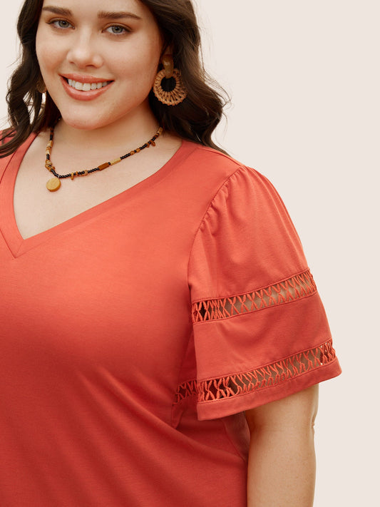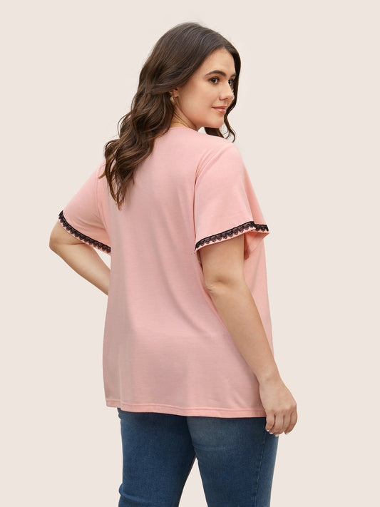 V Neck Contrast Lace Flutter Sleeve T-shirt