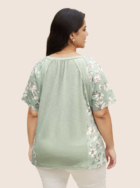 Floral Patchwork Pleated Raglan Sleeve T-shirt