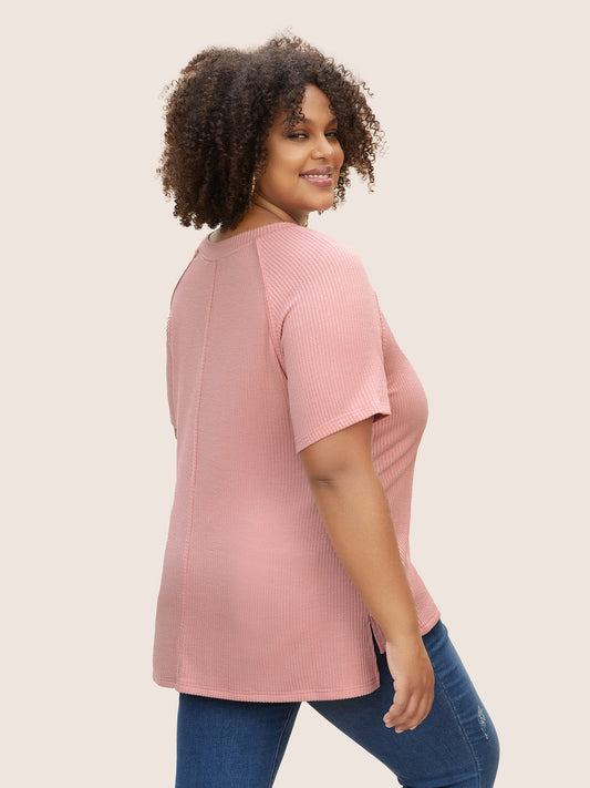 Plain Textured Raglan Sleeve Split Hem T-shirt