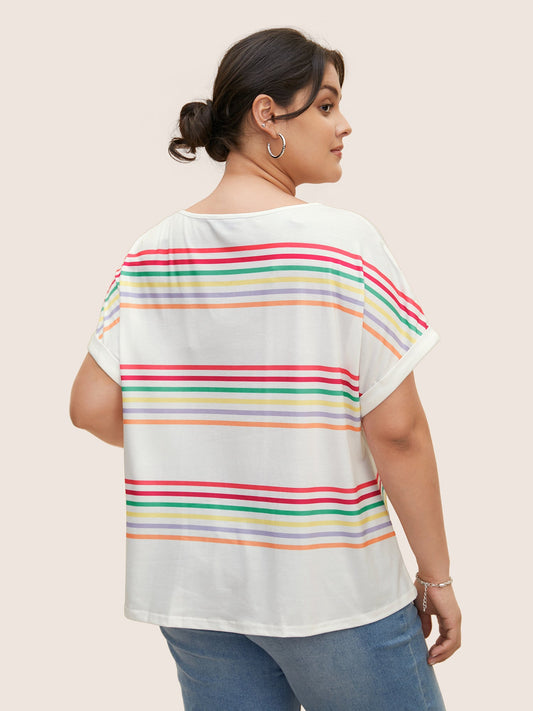Colored Striped Boat Neck Batwing Sleeve T-shirt