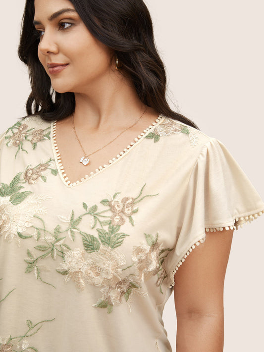 Floral Mesh Embroidered Pompom Trim T-shirt
