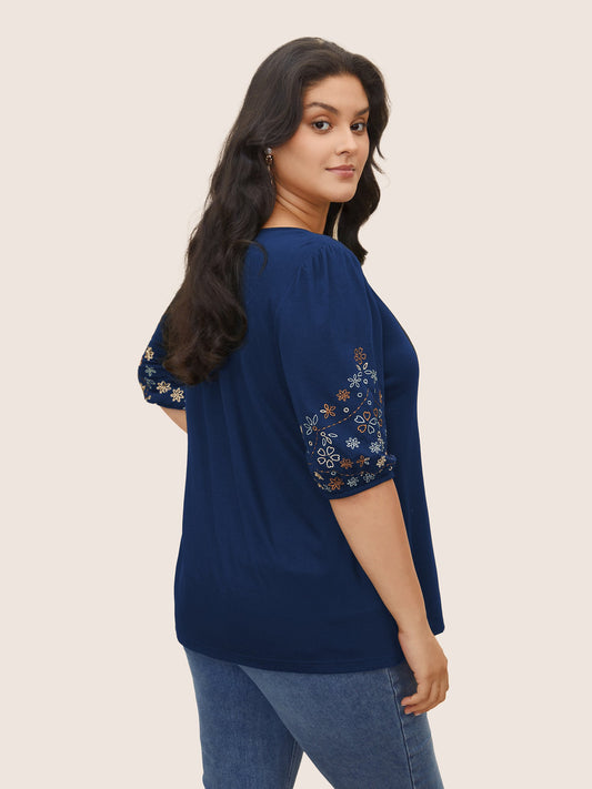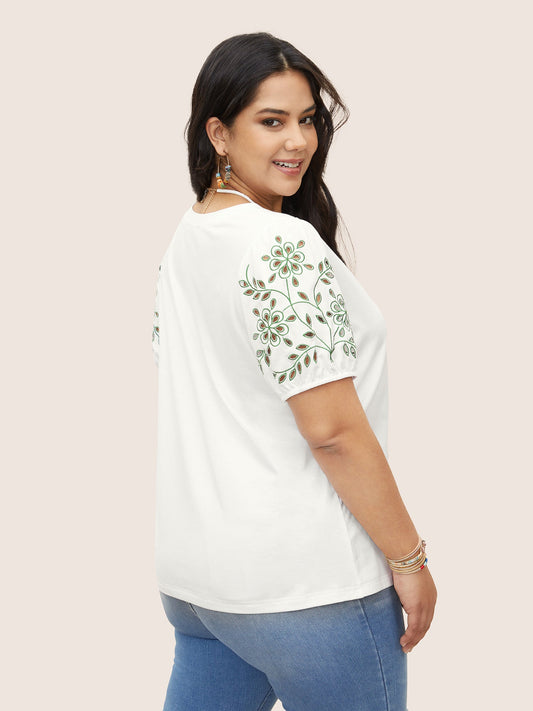 Floral Embroidered Crew Neck Puff Sleeve T-shirt