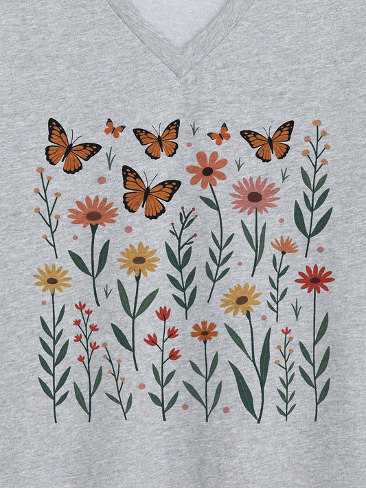 Butterflies Pattern V-Neck T-Shirt