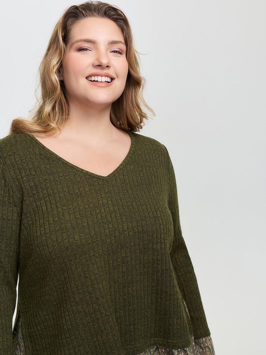 Mock Neck Lace Splicing Ribbed Texture T-Shirt