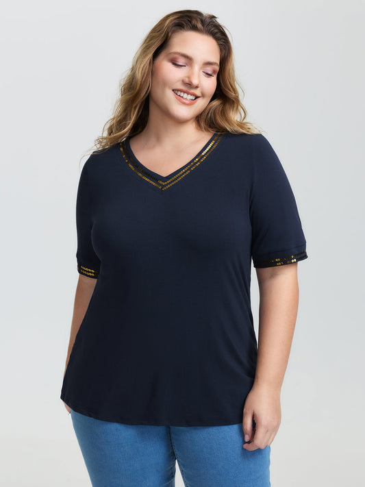 Stretchy Heart Embroidered V-Neck Knit T-Shirt