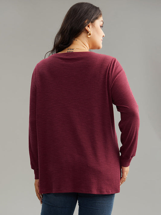 Rib Knit V Neck Button Detail T-shirt