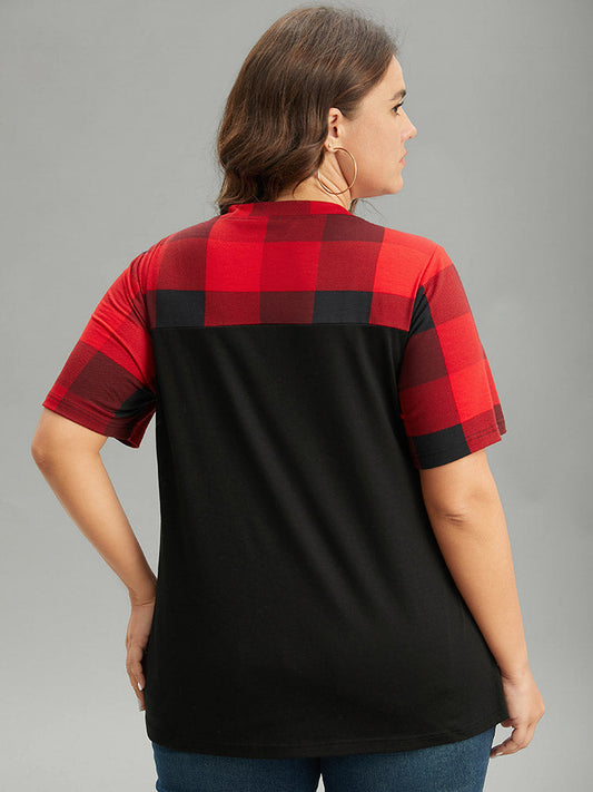 Plaid Contrast Patchwork Pocket Round Neck T-shirt