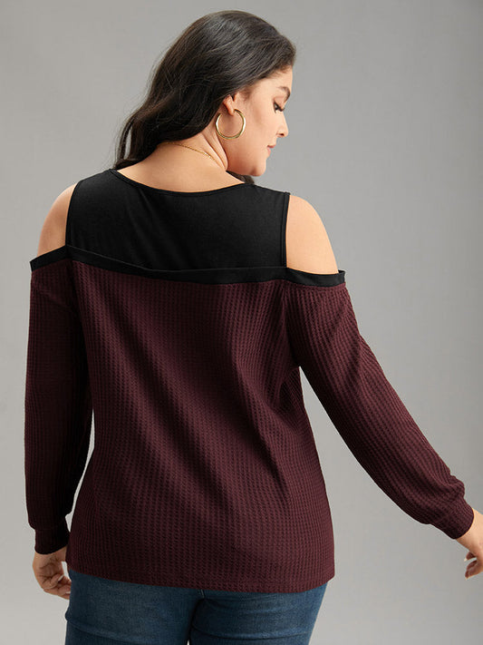Cold Shoulder Patchwork Contrast Waffle Knit T-shirt