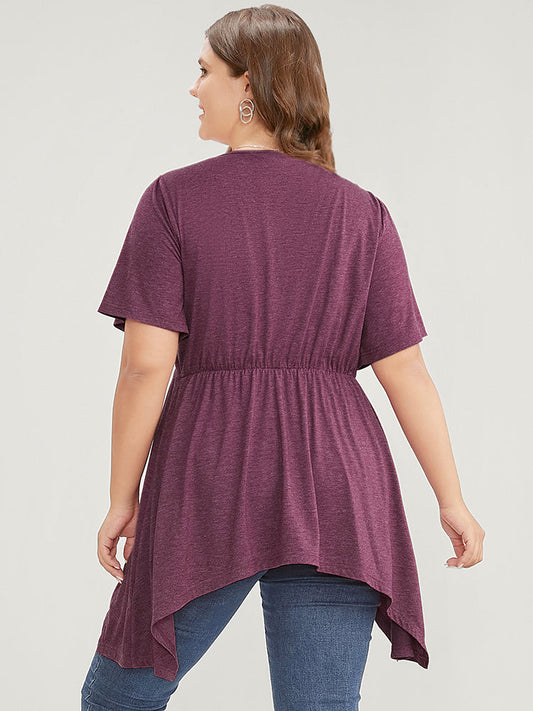 Plain V Neck Ruffle Sleeve Ruched Asymmetrical Hem T-shirt