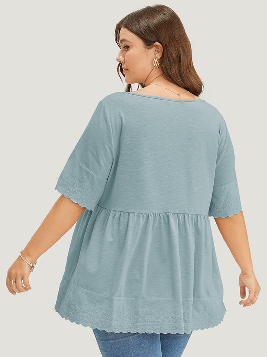 Solid Button Up Lace Scalloped Trim T-shirt
