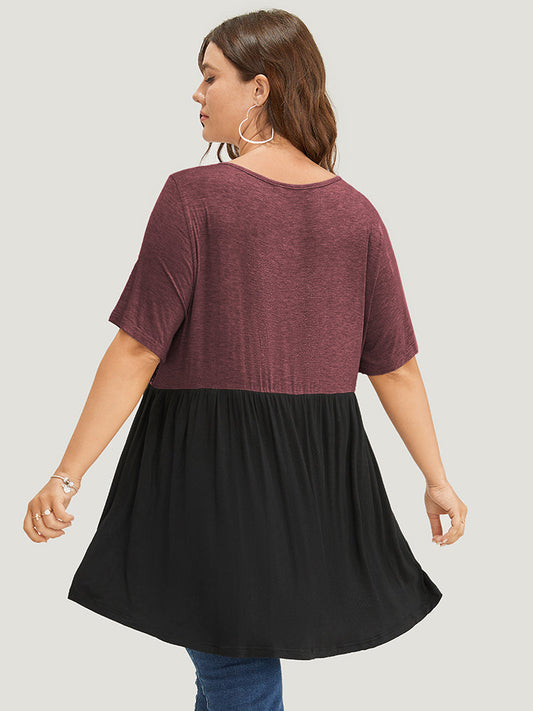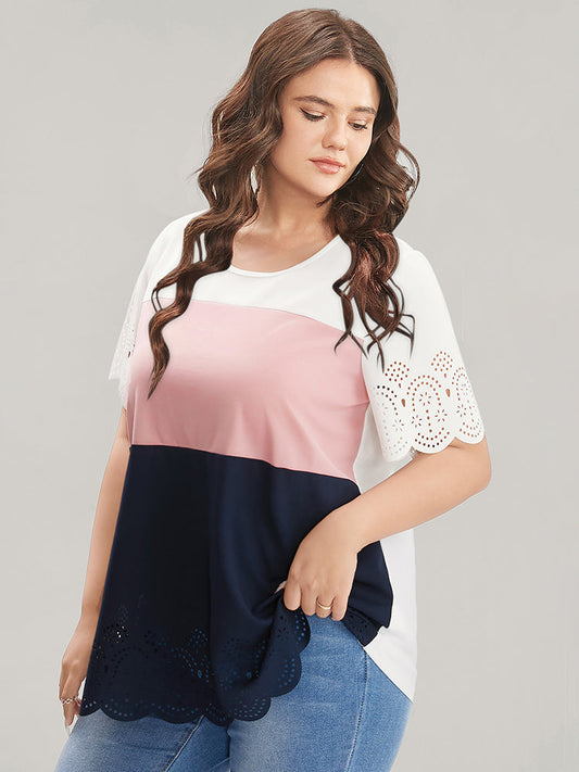 Colorblock Contrast Scalloped Trim Laser Cut Crew Neck T-shirt
