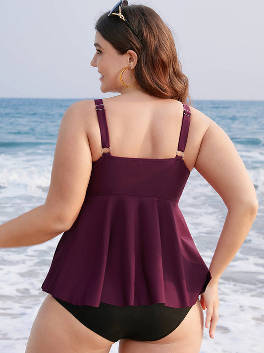 Plain Ruffles Crossover Back Adjustable Straps Tankini Top