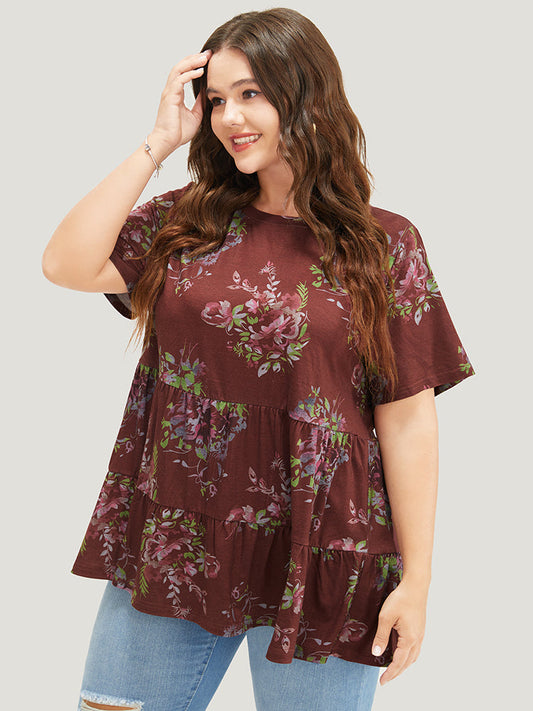 Floral Print Ruffle Tiered Round Neck T-shirt