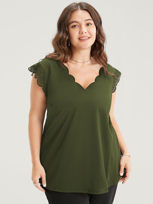 Solid Scalloped Trim Contrast Lace Tank Top