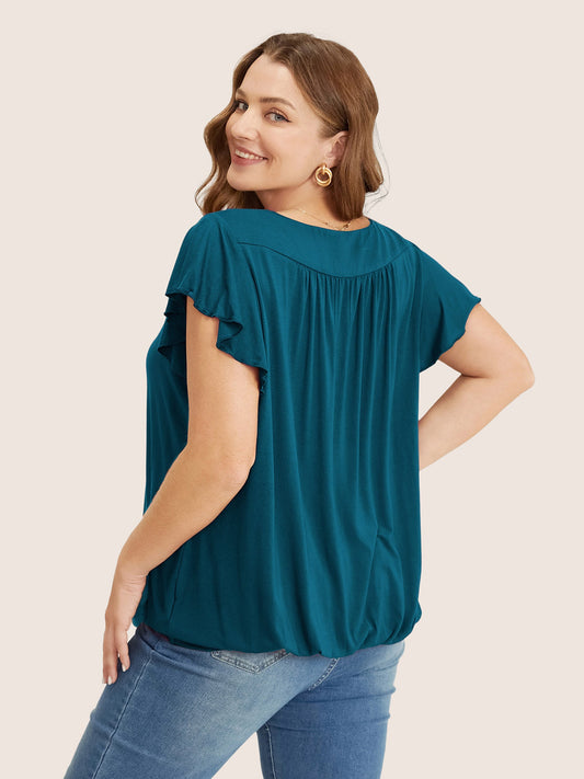 Plain Gathered V Neck Ruffle Sleeve T-shirt