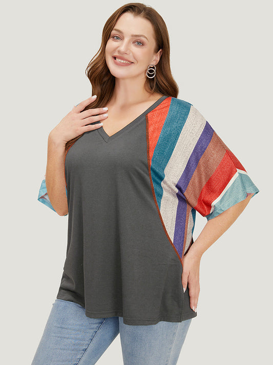 Rainbow Striped Contrast Patchwork Batwing Sleeve T-shirt