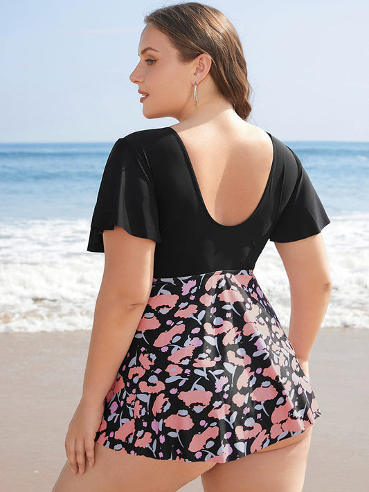 Floral Patchwork Drawstring Ruffle Sleeve Tankini Top