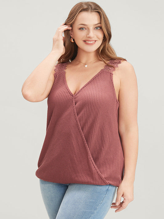Solid Wrap Contrast Lace Waffle Knit Tank Top