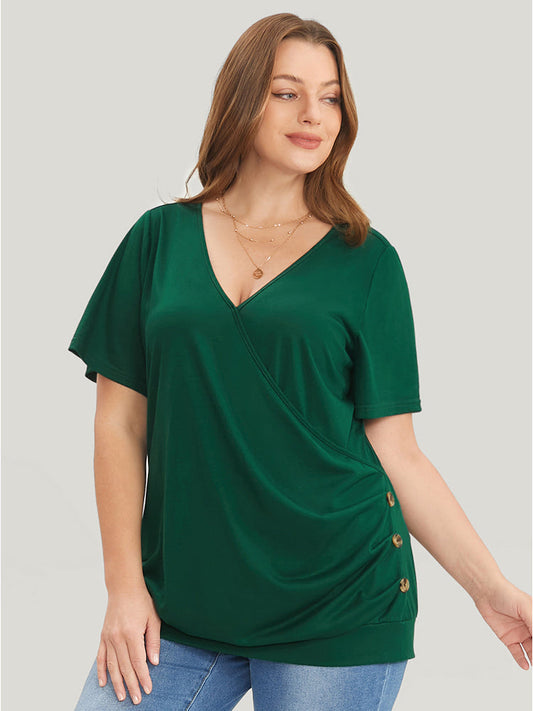 Plain Button Detail Gathered Surplice Neck T-shirt