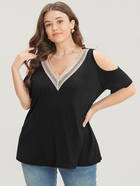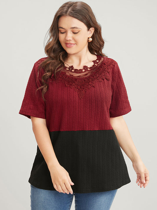 Colorblock Contrast Round Neck Lace Insert T-shirt