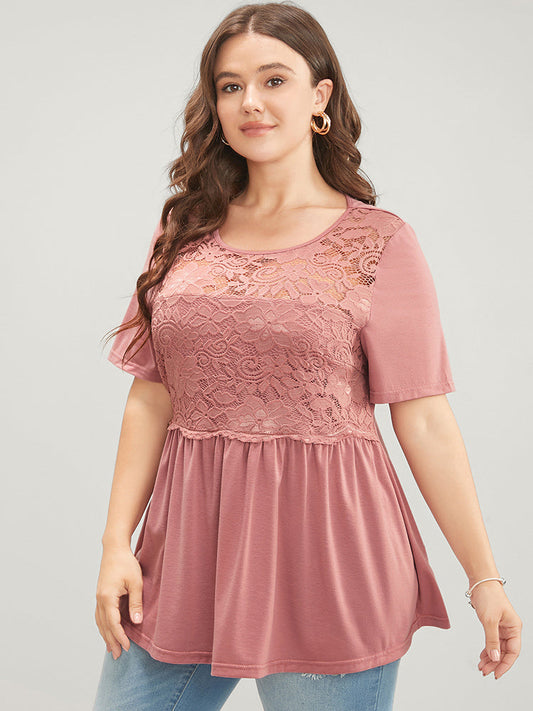 Plain Contrast Lace Crew Neck Ruffles Hem T-shirt