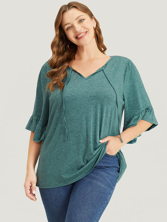 Plain V Neck Ruffle Trim Bell Sleeve T-shirt