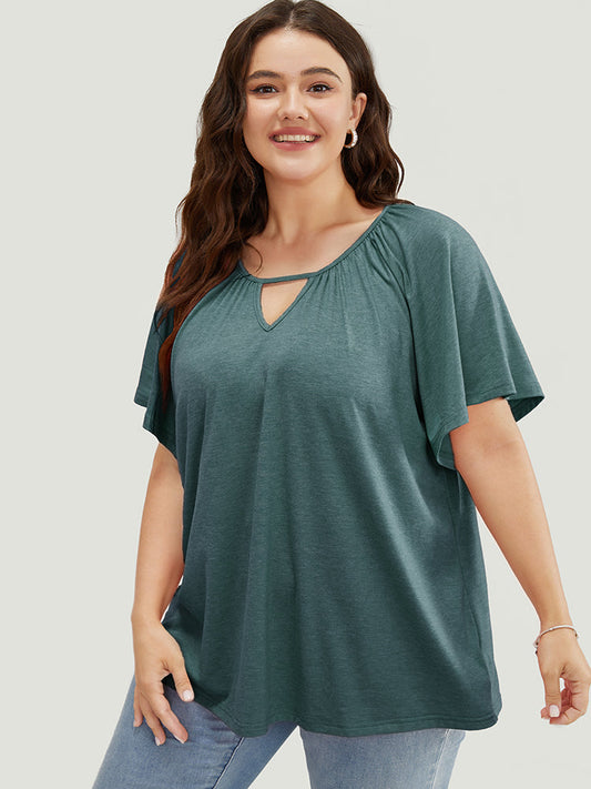 Solid Ruffle Sleeve Gathered Keyhole Neck T-shirt