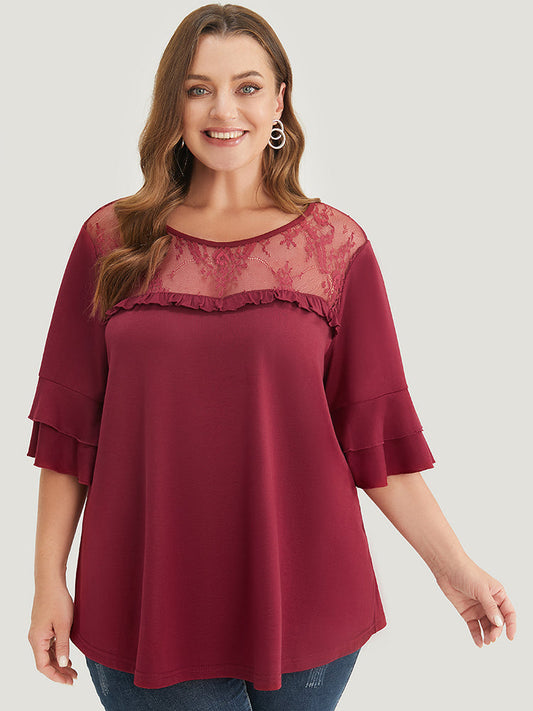 Solid Contrast Lace Ruffle Tiered Sleeve T-shirt