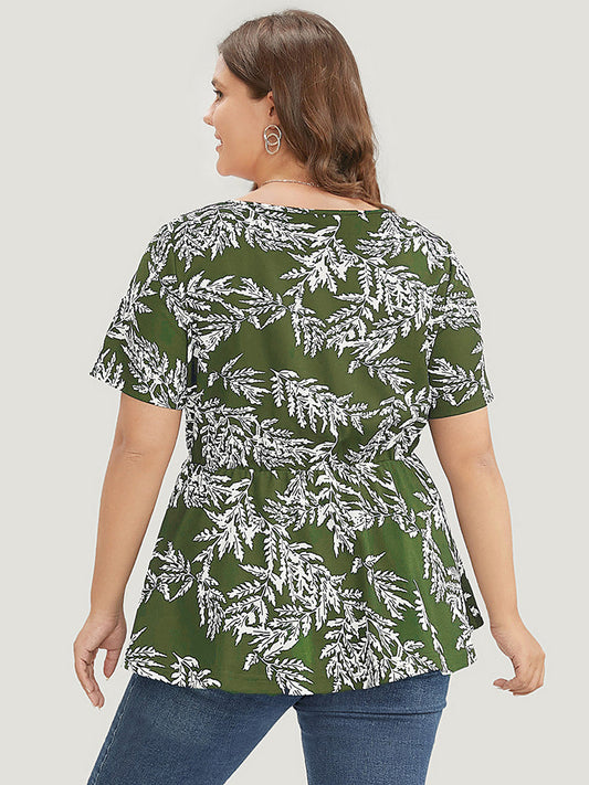 Plant Print Ruffle Hem Surplice Neck T-shirt
